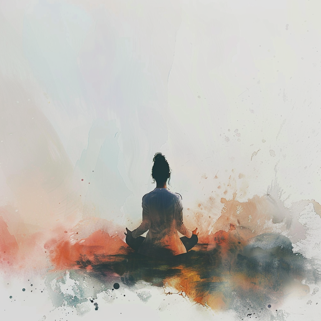 명상을 하고 있는 모습은 차분함과 성찰의 느낌을 풍기면서, 다채로운 색상과 흐르는 형태를 지닌 추상적인 배경은 명상의 내면 풍경을 반영하여 유동성과 개방성을 불러일으킨다.