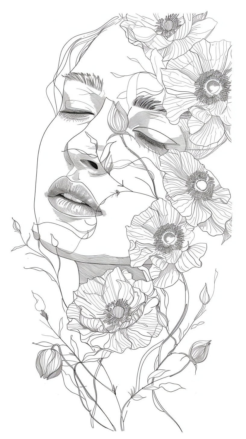 그리고 꽃은 다양한 색상과 모양으로 그려져 있으며, 복잡한 패턴을 이루고 있다. 여성의 얼굴과 꽃의 조화는 평화와 조화의 상징으로 느껴진다. 여성의 얼굴은 자연의 아름다움을 대표하며, 꽃은 자연의 생명력을 상징하는 것 같다.