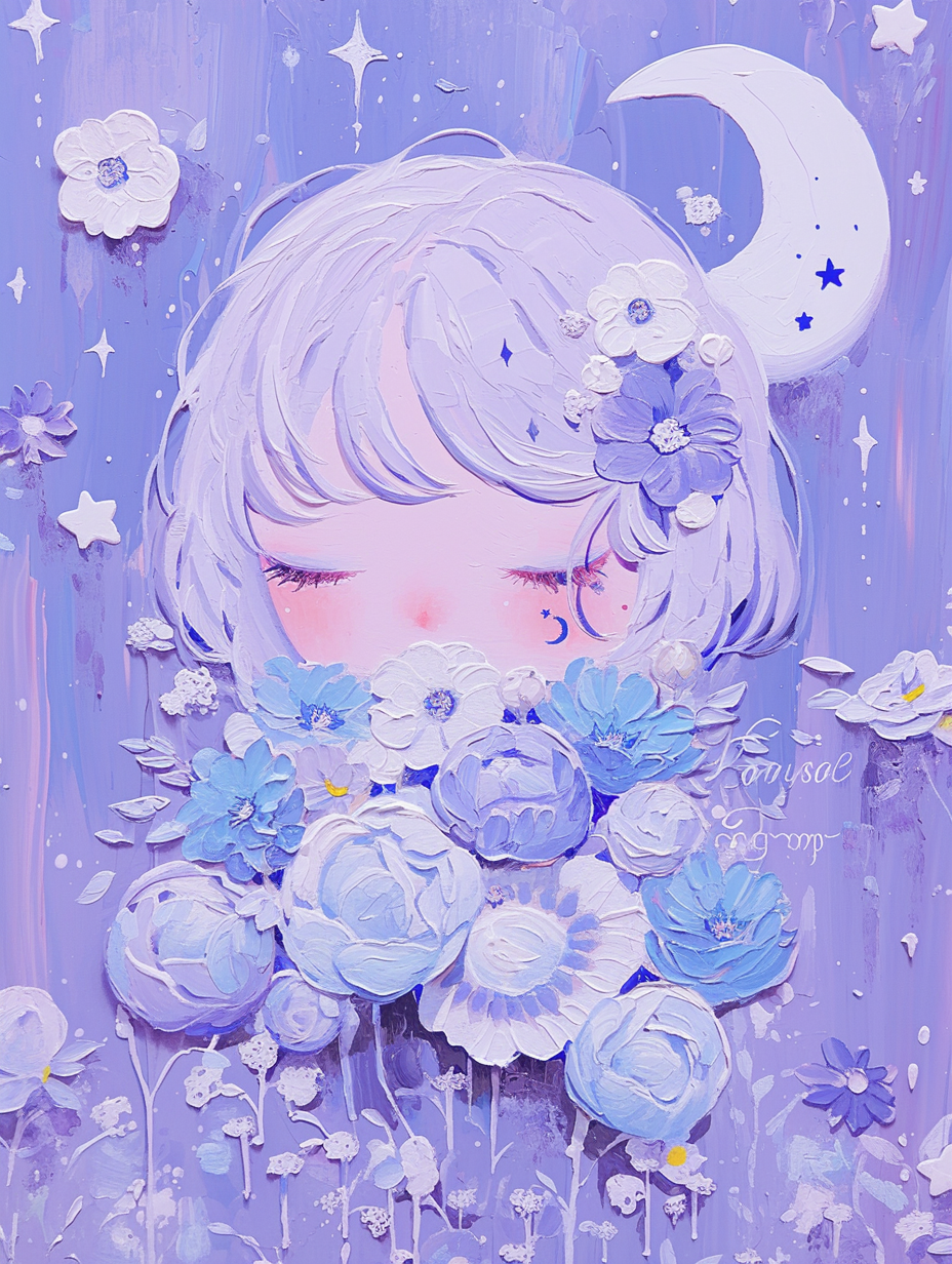 이 그림은 질감 있는 파스텔 팔레트로 고요하고 몽환적인 분위기를 자아낸다. 눈을 감은 평화로운 얼굴은 휴식이나 명상의 상태를 떠올리게 한다. 푸른색과 보라색의 무성하고 피어난 꽃으로 둘러싸인 이미지는 평온함과 자연과의 조화를 전달하기도 한다. 질감이 있는 붓놀림은 입체적으로 표현되어 꽃이 거의 만질 수 있을 것처럼 보이게 한다.
