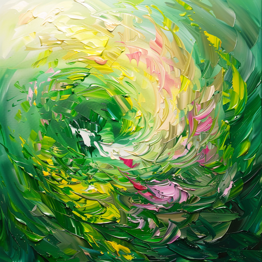 이 작품은 보자마자 핵심을 파고들면서 소용돌이치는 구성의 휩쓸고 역동적인 에너지에 즉시 매료된다. 여기서 색상의 흐름은 단순한 움직임이 아니라 진화하는 여정을 상징한다. 이는 매우 개인적이고 동시에 보편적인 느낌을 준다. 녹색이 밝은 노란색과 부드러운 핑크색과 자연스럽게 어우러지는 방식은 성장, 자연, 재생의 느낌을 불러일으킨다. 마치 붓질 자체가 캔버스에 생명을 불어넣는 것처럼 자연의 순환, 재생의 끊임없는 리듬을 느낀다.