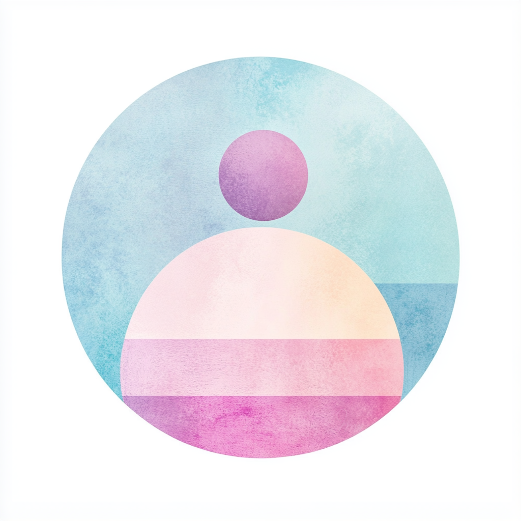 가장 먼저 시선을 끄는 것은 화면 중앙의 보랏빛 구체이다. 나는 이 구체를 '자아'의 표상으로 읽는다. 보랏빛은 신비로움과 내면의 고요를 상징하며, 이 인물 없는 인물은 시공간을 초월한 존재처럼 느껴진다. 아래의 반원은 그 자아가 떠 있는 수면, 혹은 감정의 층위처럼 보인다. 이 반원은 온화한 크림색에서 시작해 분홍, 자줏빛으로 자연스럽게 물들어 가는데, 그 색의 흐름을 따라가다 보면 마치 감정이 서서히 깊어지는 과정을 관찰하는 듯한 기분이 든다.