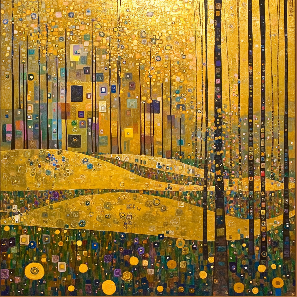이 작품은 마치 자연 그 자체가 황금빛 빛에 잠긴 듯 평온함과 시대를 초월한 아름다움을 보여준다. 나무의 수직선은 장엄한 숲의 기둥처럼 서 있고, 모자이크 같은 사각형과 원형은 자연 요소와 추상 미술의 조화로운 모습이다. 마치 작은 것 하나하나가 이야기를 담고 있는 꿈같은 숲에 들어선 것 같은 느낌이 든다. 부드러운 흙빛 색상과 대조되는 생동감 넘치는 골드 톤은 마치 햇빛이 풍경 위에 영원히 자리 잡은 것처럼 따뜻함과 풍요로움을 불러일으킨다.