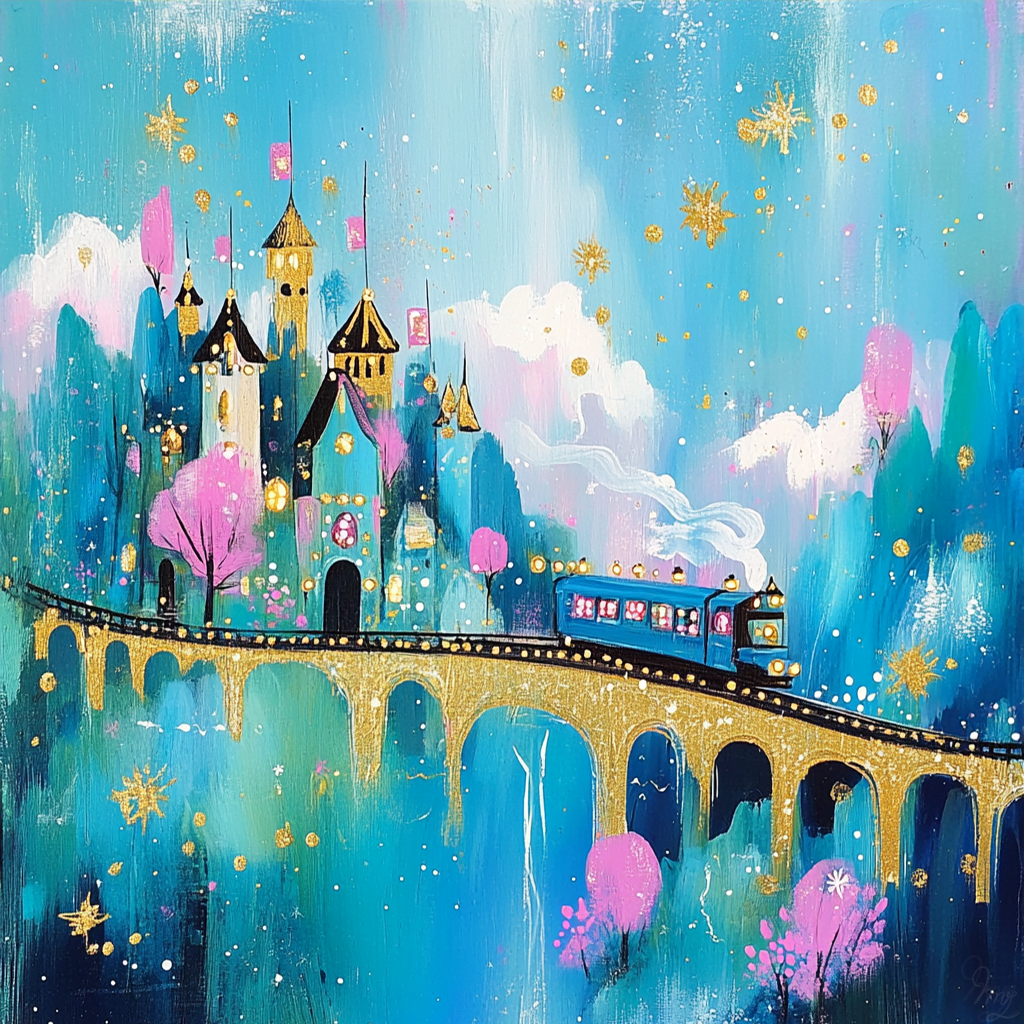 작품 ‘작은 왕국’을 감상하며 가장 먼저 눈에 들어온 것은 파스텔 톤의 몽환적인 색감과 금빛으로 빛나는 다리였다. 이 그림은 단순한 풍경이 아니라, 마치 오랜 꿈속에서 한 번쯤 떠올려보았을 법한 장면을 그대로 꺼내놓은 듯한 느낌을 준다. 푸른색의 안개처럼 번진 배경 위에 핑크빛 나무와 별 조각들이 흩어져 있고, 그 사이를 조심스럽게 기차 한 대가 달려간다. 이 모든 요소가 합쳐져, 현실과 환상의 경계가 흐려지는 듯한 경험을 하게 만든다. 그래서 이 작품을 마주한 순간, 나 역시 어린 시절 상상하던 '나만의 세계'로 되돌아간 듯한 기분이 들었다.